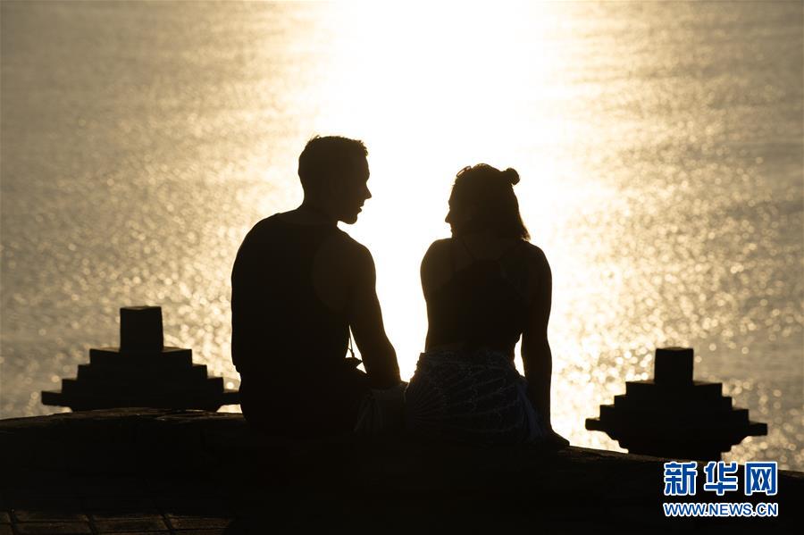 2月25日,在印度尼西亚巴厘岛情人崖,一对情侣欣赏日落景色。 情人崖雄奇险峻的风景吸引着许多游客前来参观游览。 新华社记者 杜宇 摄