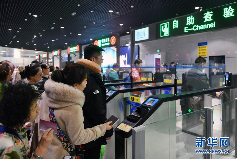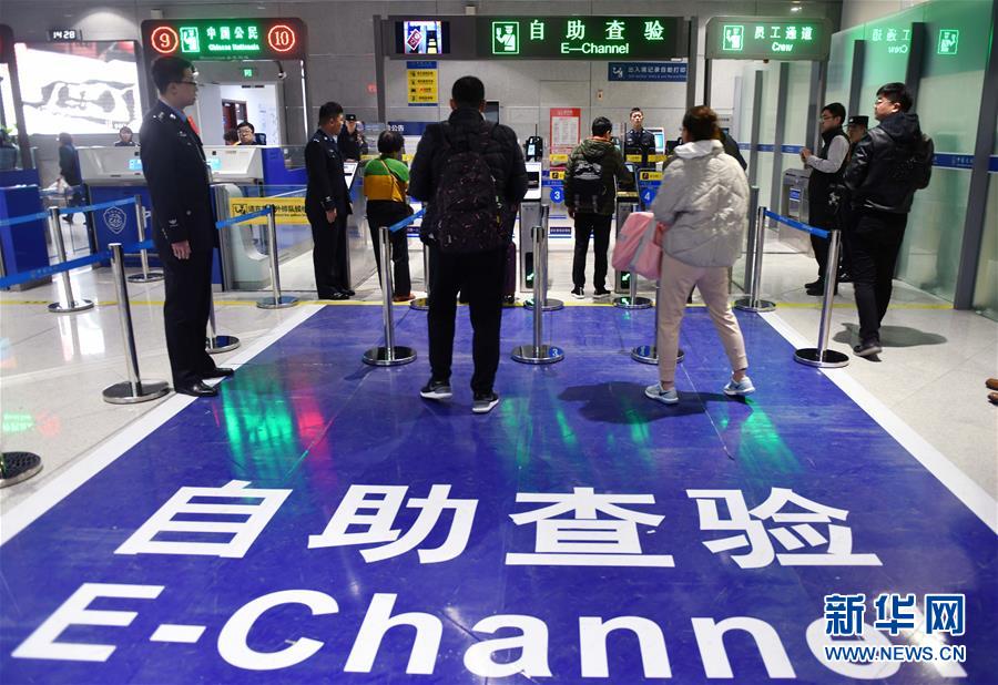 2月27日,旅客在自助查验通道通关。 日前,山东烟台机场出入境边防检查站积极落实“放管服”要求,及时科学调整人工通道和自助通道设置比例,加快推进自助通道升级改造,有效提升了出入境通关效率。 新华社记者 朱峥 摄