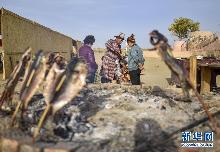 在新疆尉犁县罗布人村寨里,罗布人阿布冬(中)在销售自己做的烤鱼(2018年10月16日摄)。 2018年,新疆全年旅游人数突破1.5亿人次,增长40%以上。2019年春节假期,接待游客超过300万人次,创历史新高。 新华社记者 赵戈 摄