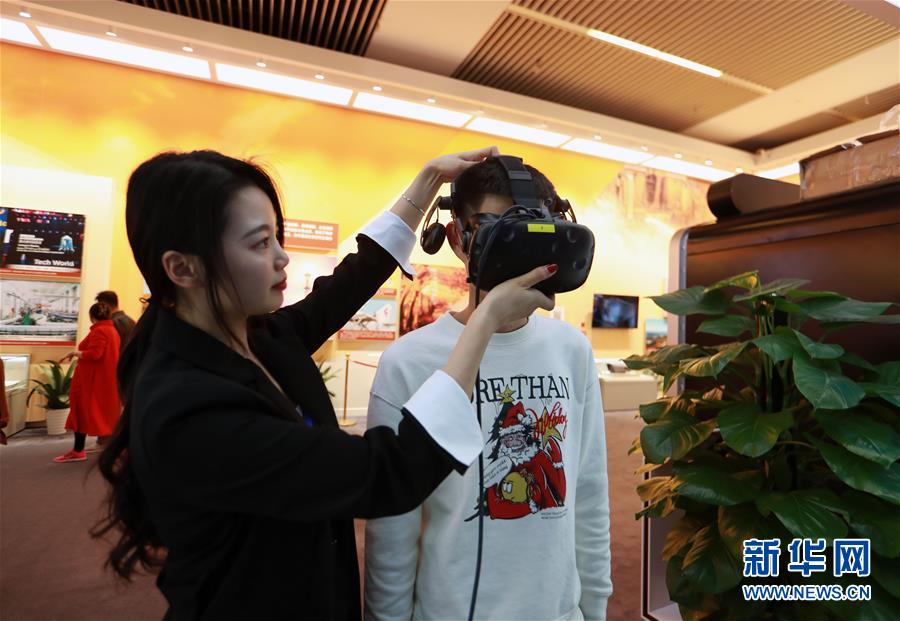 3月5日,工作人员(左)在展览上为参观者佩戴VR眼镜。 截至3月5日,在北京中国国家博物馆举办的“伟大的变革——庆祝改革开放40周年大型展览”累计现场观众达3982195人次。 新华社记者 潘旭 摄