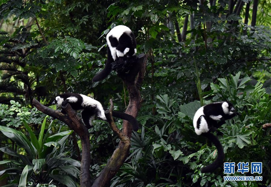 3月6日,在广州长隆野生动物世界,斑狐猴三胞胎在树枝上跳跃。
