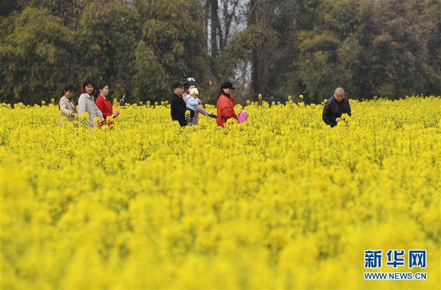 3月6日,游人在四川广汉市西高镇的油菜花公园里游玩。 新华社记者刘坤摄