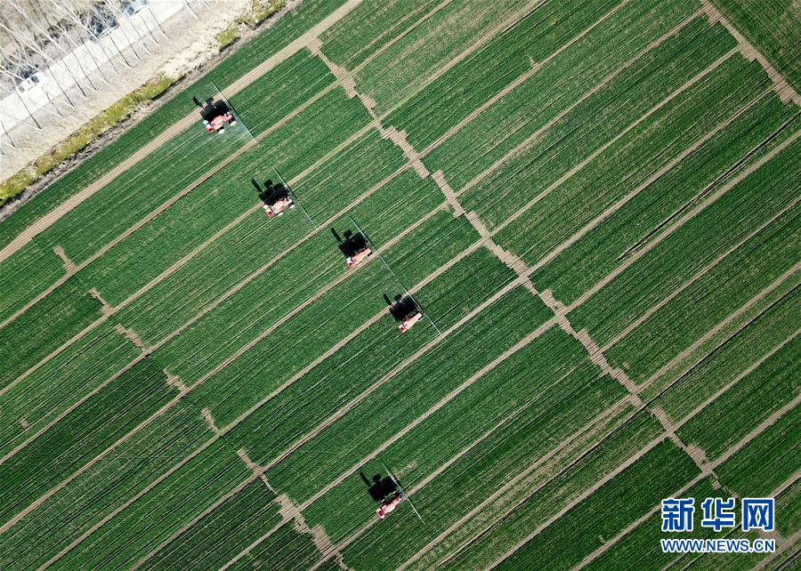 3月7日,在安徽省五河县龙潭湖良种示范繁殖农场,农业机械在麦田喷洒农药(无人机拍摄)。新华社记者刘军喜摄
