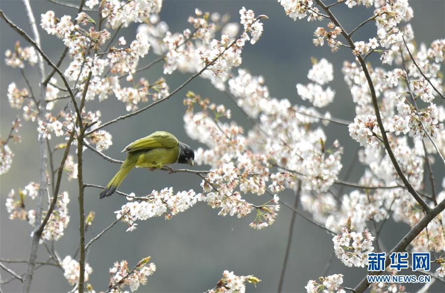 3月14日,鸟儿在湖北省恩施土家族苗族自治州宣恩县万寨乡长堰沟村的花枝间停留。 新华社发(宋文 摄)