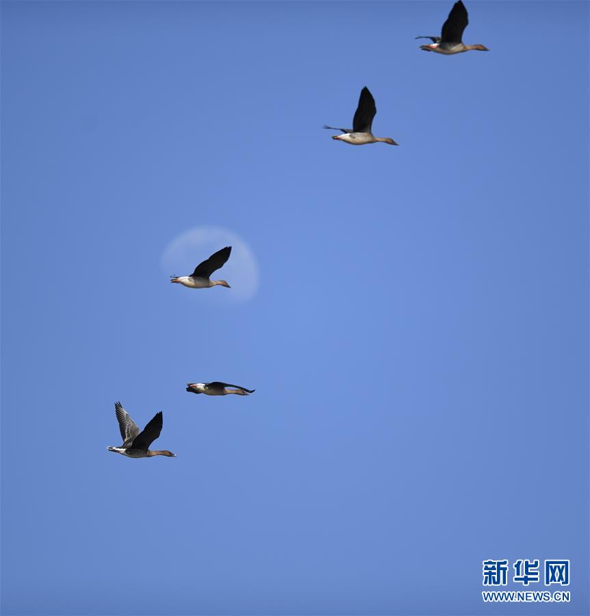 3月17日,候鸟在卧龙湖湿地上空飞翔。 近日,多种候鸟飞临位于辽宁省康平县的卧龙湖湿地。 新华社记者 龙雷 摄