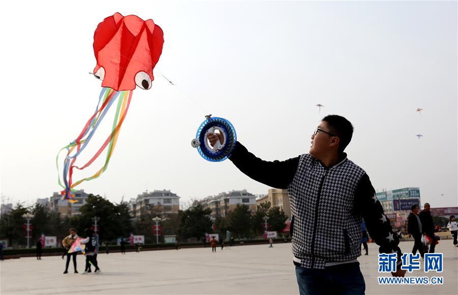 3月17日,小朋友在山东省枣庄市光明广场放风筝。 新华社发(孙中喆 摄)