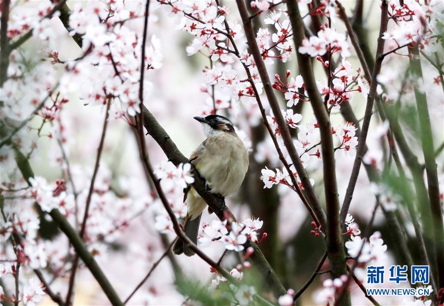 3月19日,在贵州省铜仁市玉屏侗族自治县,一只小鸟在花枝上停留。 新华社发(胡攀学 摄)