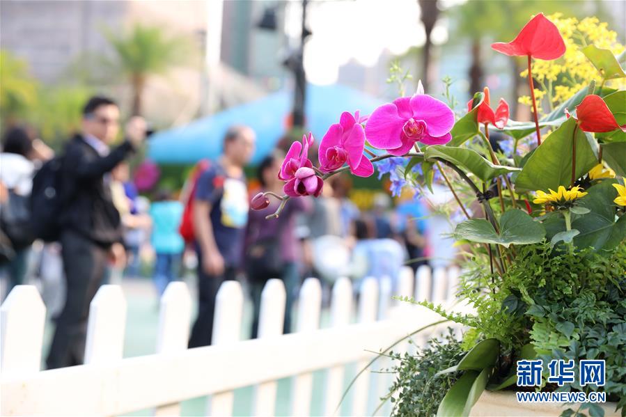 3月19日,游客在香港花卉展览上赏花拍照。 近日,正在香港维多利亚公园举办的香港花卉展览吸引众多市民、游客前来游玩。 新华社记者 吴晓初 摄