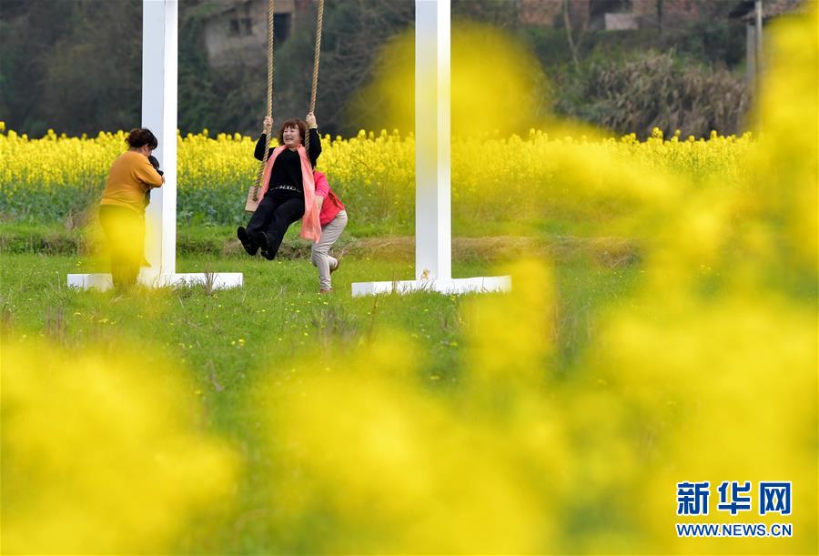 3月15日,游客在江西省萍乡市湘东区东桥镇的油菜花田边游玩。 随着天气转暖,赣西地区大片油菜陆续开花,美不胜收,吸引周边地区的游客前往观赏游玩。 新华社记者 彭昭之 摄