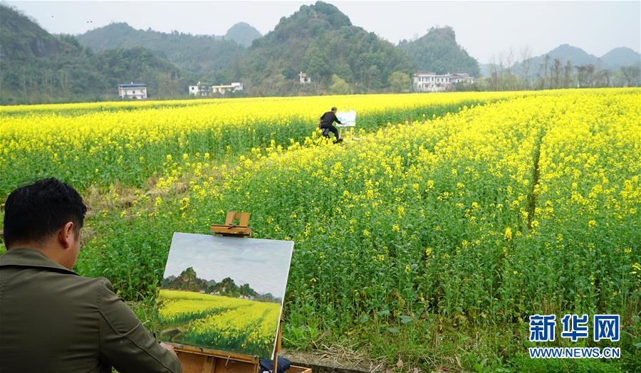 3月15日,在江西省萍乡市湘东区东桥镇的油菜花田边,当地文化馆的工作人员在写生。 随着天气转暖,赣西地区大片油菜陆续开花,美不胜收,吸引周边地区的游客前往观赏游玩。 新华社记者 彭昭之 摄