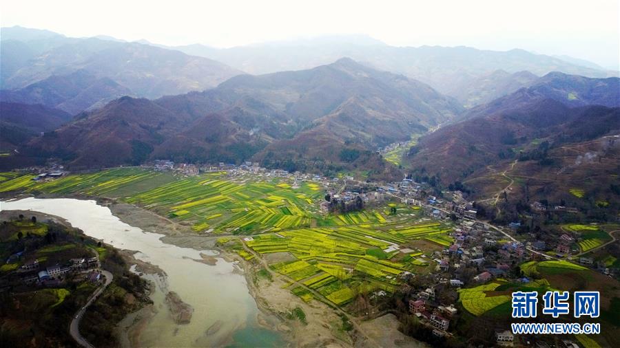 陕西汉中宁强县燕子砭镇夏家咀田园春景(3月17日无人机拍摄)。 近日,陕西汉中油菜花渐次开放,田间春意盎然。 新华社记者 刘潇 摄