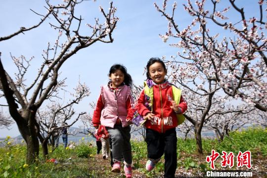 蓝天白云下,孩子们在杏林里追逐嬉戏。 朱志庚 摄