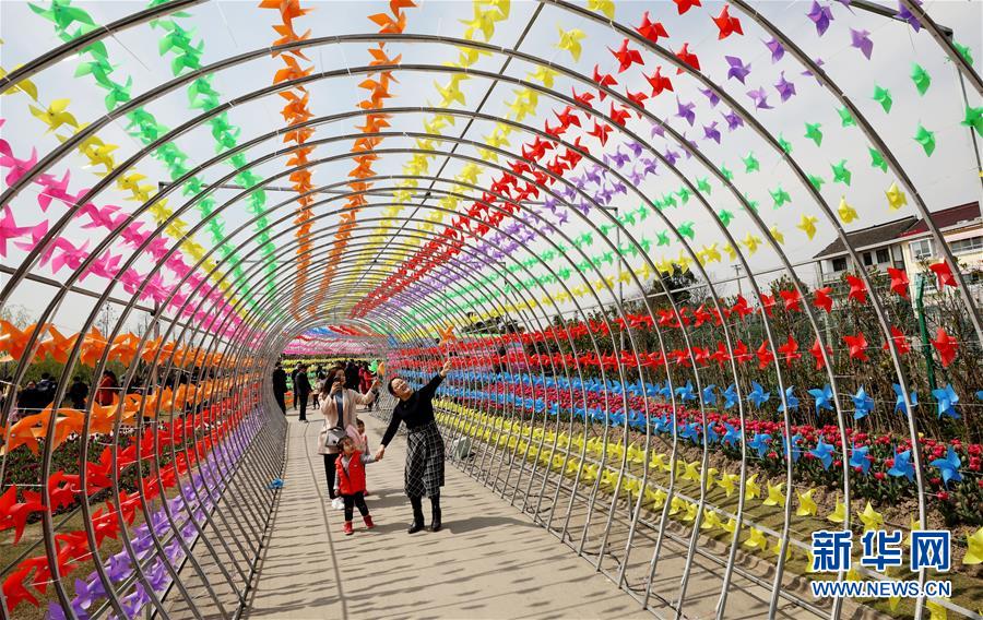 3月23日,游客行走在由彩色风车装饰的长廊里。