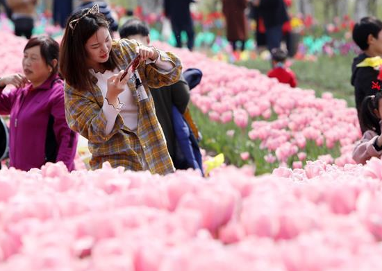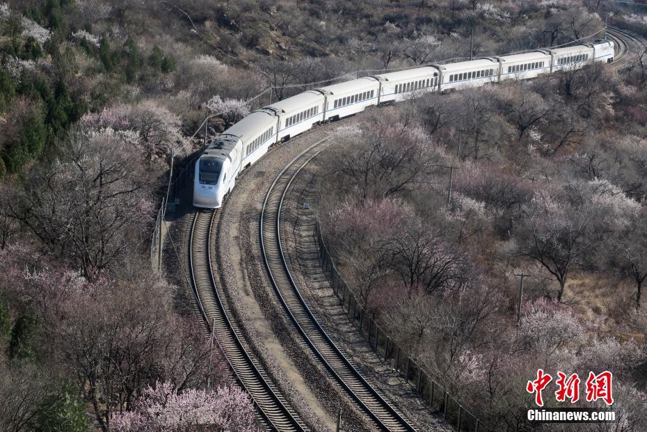 3月25日,一列火车在北京居庸关附近的山花中穿行。近日,北京居庸关长城附近山花烂漫,春意盎然,火车穿行其间,成为春日里一道美丽的风景线。中新社记者 孙自法 摄