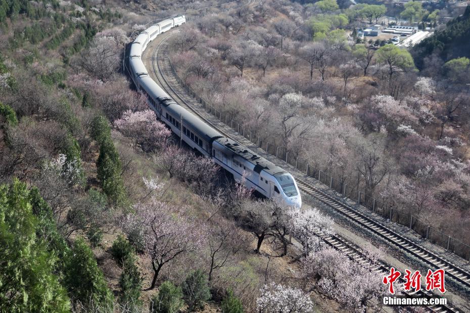 3月25日,一列火车在北京居庸关附近的山花中穿行。近日,北京居庸关长城附近山花烂漫,春意盎然,火车穿行其间,成为春日里一道美丽的风景线。中新社记者 孙自法 摄