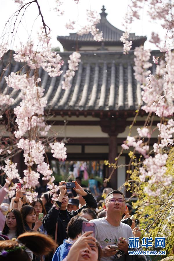 3月25日,游人在西安青龙寺拍照游玩。 近日气温回升,陕西西安青龙寺遗址庭园内樱花绽放,吸引大批游客前往踏春赏花。西安青龙寺是唐代著名佛教寺院之一,20世纪八十年代,青龙寺从日本引进多个名贵品种的樱花树植于寺院。 新华社记者 邵瑞 摄