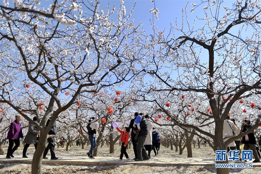 3月26日,游客在河北省巨鹿县西韩庄村杏林内游览。 近日,随着气温回升,河北省巨鹿县杏花相继开放,吸引众多游客前来踏春赏花。 新华社记者 牟宇 摄