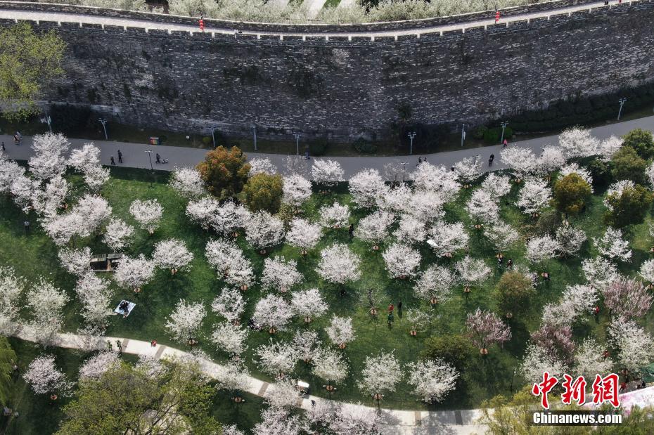 3月26日,航拍南京明城墙解放门至玄武门段,春日里樱花盛放,山水城林相得益彰,组成了一幅美丽的画卷。中新社记者 泱波 摄