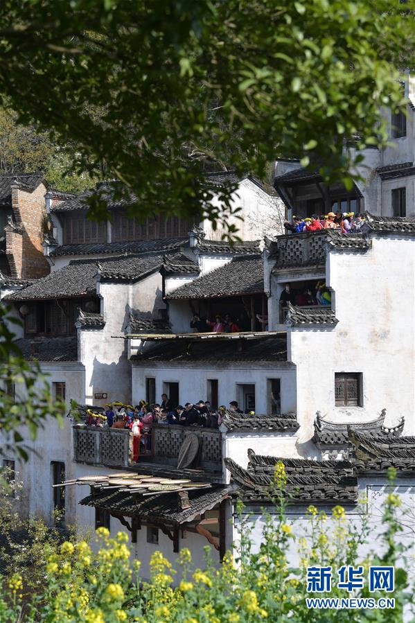 游客在江西省婺源县篁岭景区游玩踏春(3月26日摄)。 近日,素有“梦里老家”之称的江西省婺源县迎来油菜花的盛花期,油菜花与徽派古宅、层层梯田相互辉映,吸引游客前来赏花踏春。 新华社记者 彭昭之 摄