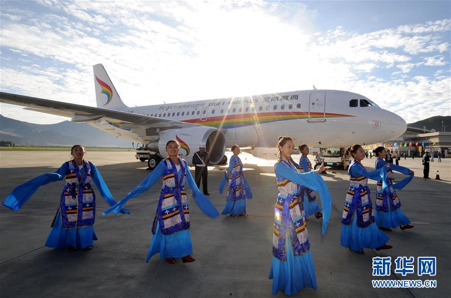 演员在西藏航空有限公司成立暨首航仪式上表演藏族歌舞(2011年7月26日摄)。 旧西藏没有一条正规的公路。目前西藏已基本形成了以公路、铁路、航空为主体的综合立体交通网络。 新华社记者 觉果 摄