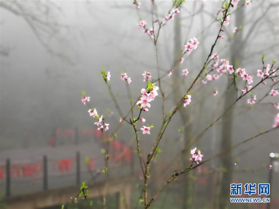 这是3月27日在安徽省黄山市齐云山风景区拍摄的鲜花。 当日,安徽省黄山市齐云山风景区云雾缭绕,风景秀美。 新华社记者 张岩 摄