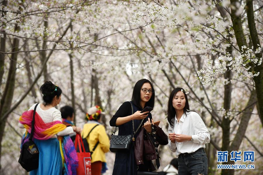3月27日,游客在贵州省贵安新区樱花观光园赏花。 仲春时节,位于贵州省贵安新区樱花观光园内的樱花竞相绽放,如白雪般的樱花海吸引众多游客前来赏花观光。 新华社记者 杨文斌 摄
