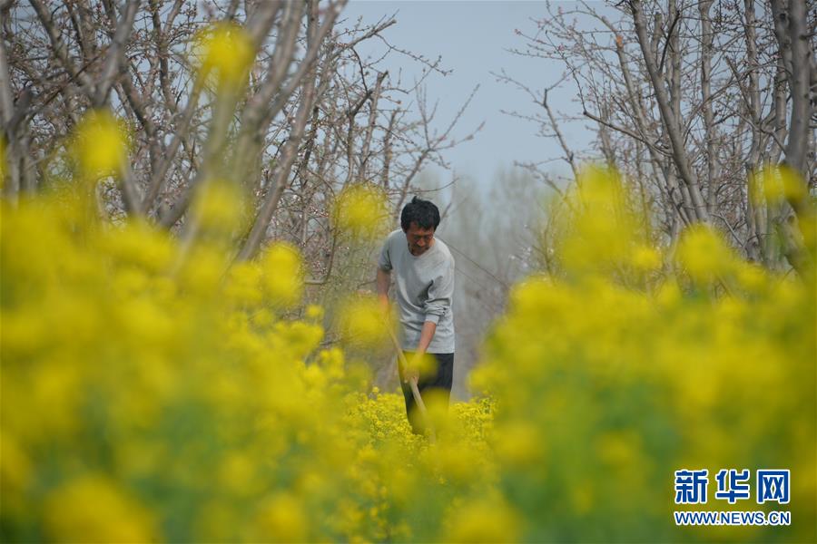 3月27日,山东省聊城市茌平县贾寨镇耿三庄村的农民在田间劳作。三月春暖,春花绽放,各地农民伴着花香忙碌在田间地头。 新华社发(赵玉国 摄)