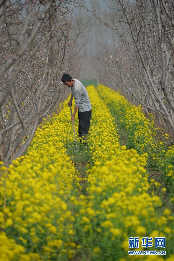 3月27日,山东省聊城市茌平县贾寨镇耿三庄村的农民在田间劳作。三月春暖,春花绽放,各地农民伴着花香忙碌在田间地头。 新华社发(赵玉国 摄)
