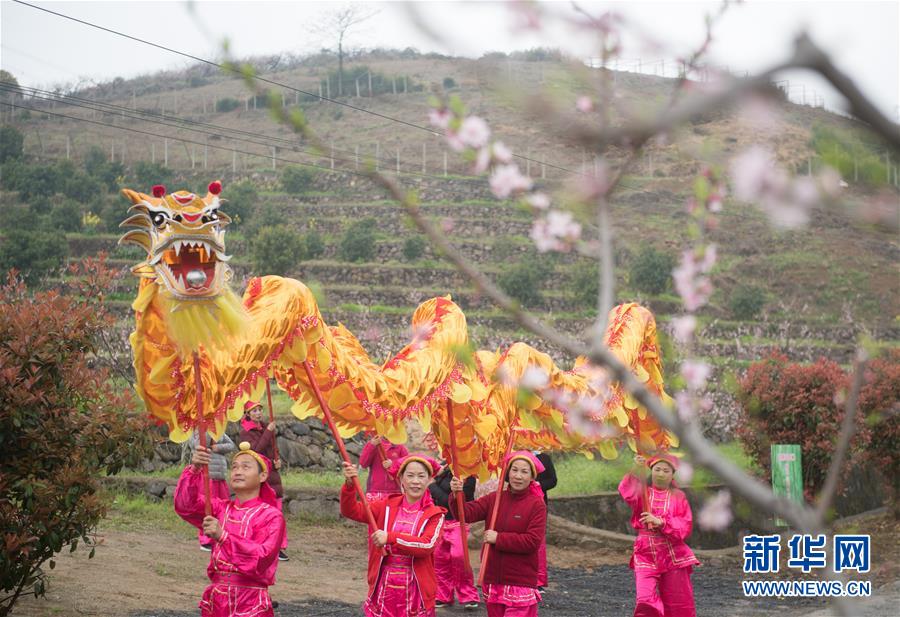 3月29日,乡村舞龙队在窑北桃园桃花林中行进。近日,浙江省杭州市余杭区窑北桃园数千亩桃花开放,吸引游客前来观赏。新华社记者 翁忻旸 摄