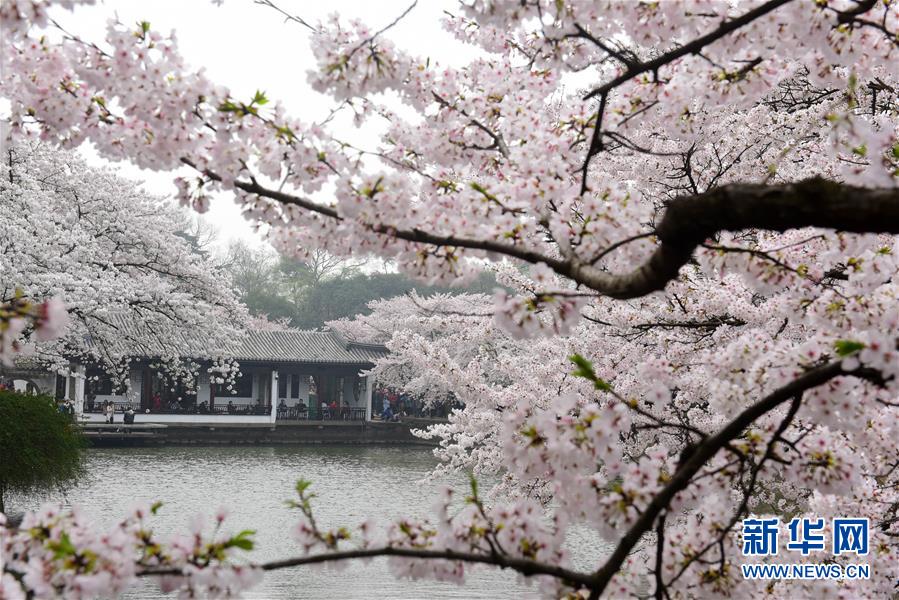 3月30日,游客在江苏无锡太湖鼋头渚风景区观赏樱花。 新华社发(还月亮 摄)