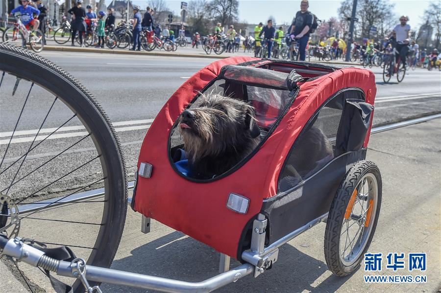 3月31日,在奥地利维也纳,一名自行车爱好者带着自己的宠物参加2019自行车骑行嘉年华活动。当日,奥地利维也纳举行2019自行车骑行嘉年华活动,吸引了约15000名自行车爱好者参与。新华社记者郭晨摄