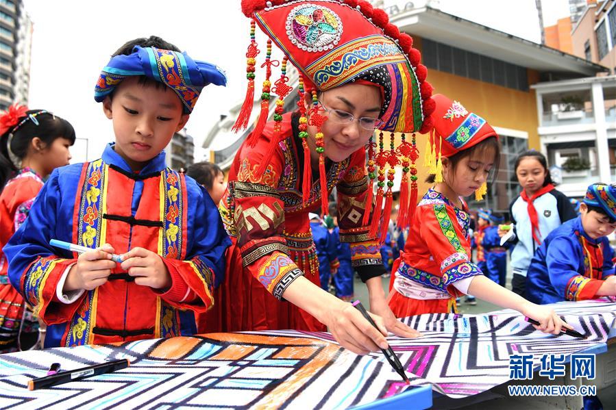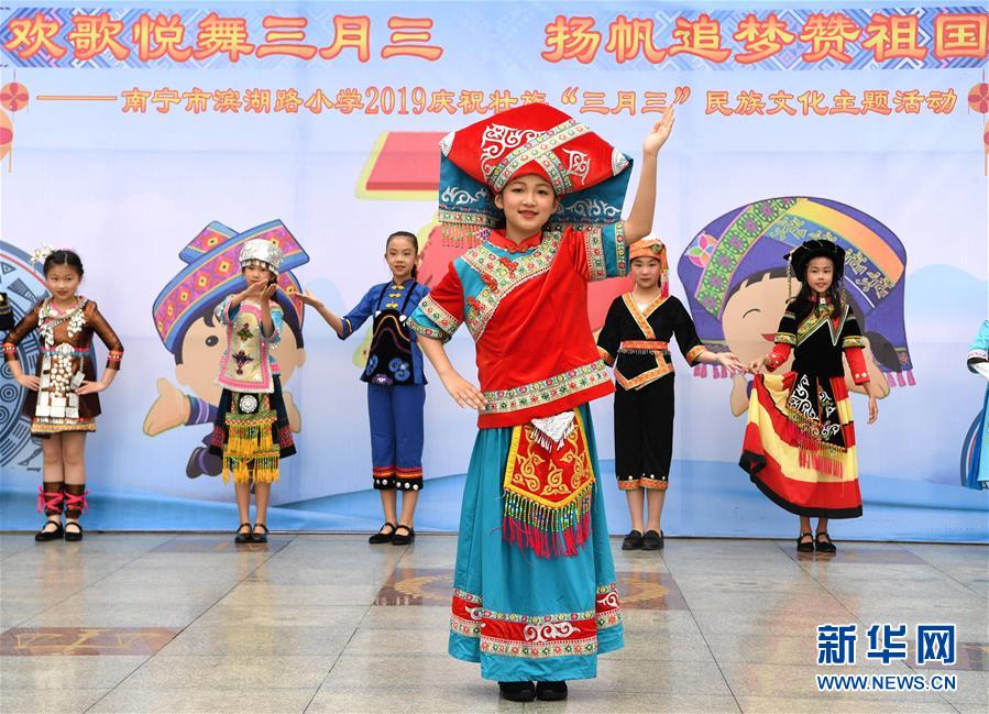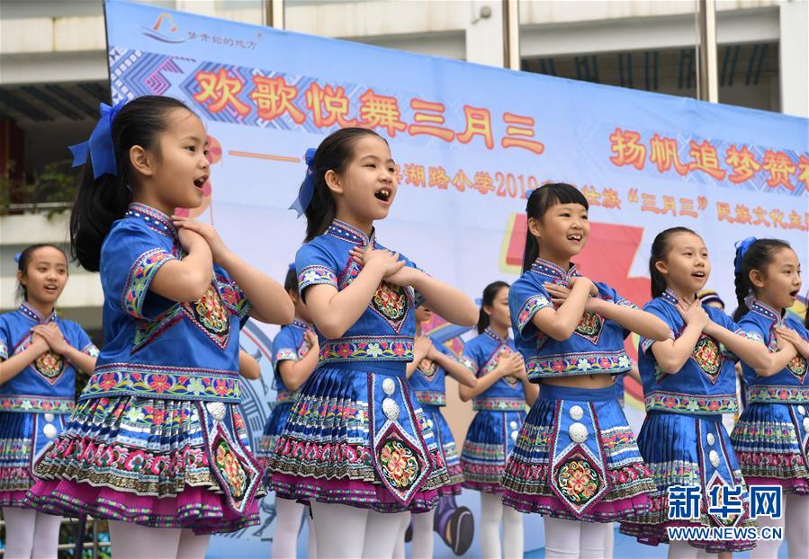 当日,广西南宁市滨湖路小学举行“欢歌悦舞三月三 扬帆追梦赞祖国”民族文化主题系列活动,师生在欢歌笑语中感受民族文化的魅力,尽享欢乐。 新华社记者 周华 摄