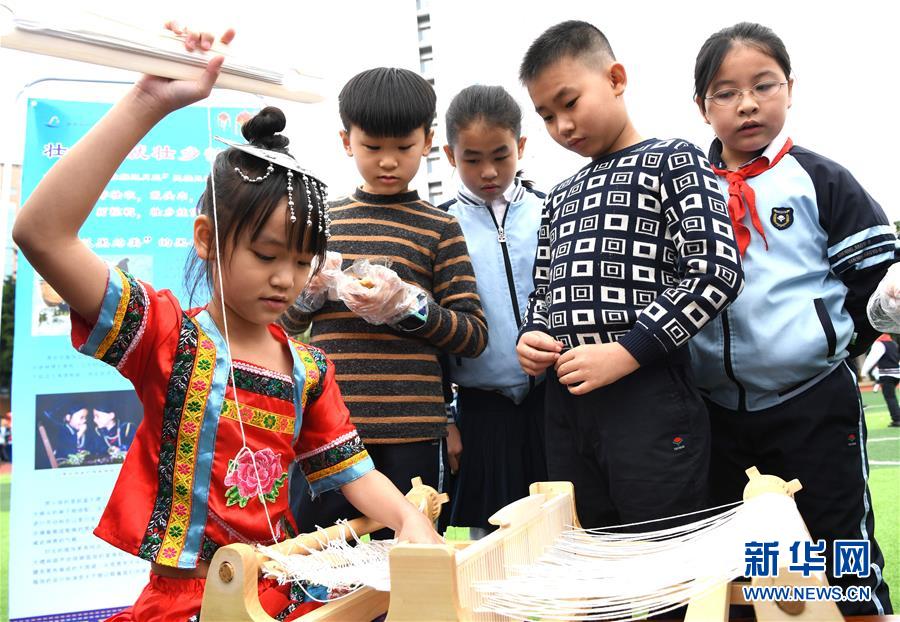 4月1日,在南宁市滨湖路小学,一名学生展示织布技艺。新华社记者 周华 摄