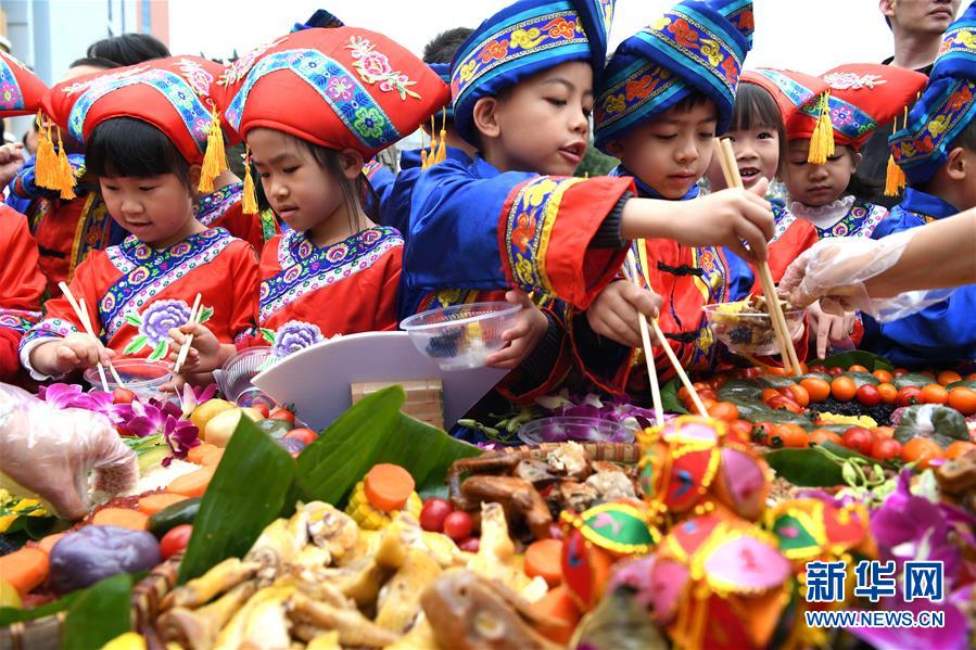 4月1日,南宁市滨湖路小学的学生在品尝民族美食。新华社记者 周华 摄