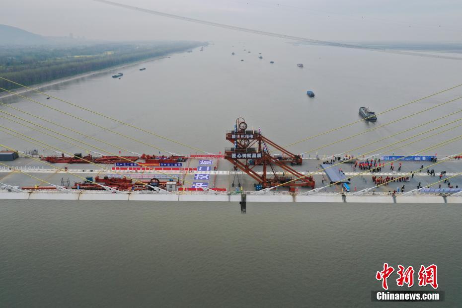 该大桥使用了“系列根式基础成套技术”和“皮肤功能混凝土”等先进技术,其中“皮肤功能混凝土”从外观上看比普通混凝土更为细腻、光滑,不仅美观,而且抗损能力得到极大提升。图为航拍池州长江公路大桥顺利合龙现场。 韩苏原 摄
