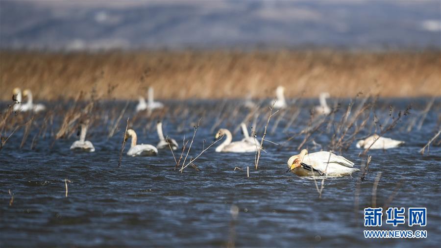 4月2日,大天鹅在白石水库湿地自然保护区休息。 新华社记者 潘昱龙 摄