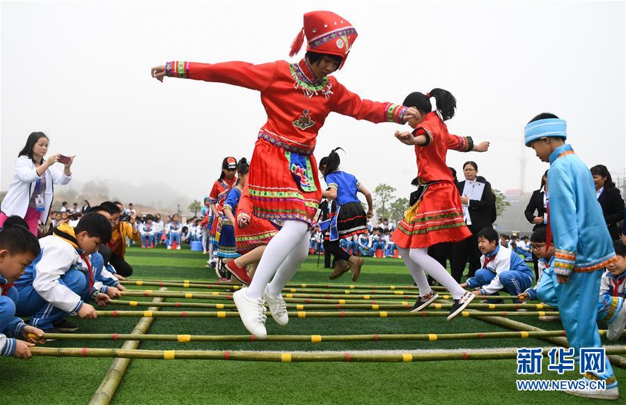 4月2日,钦州市第三十八小学的学生在跳竹竿舞。 新华社记者 张爱林 摄