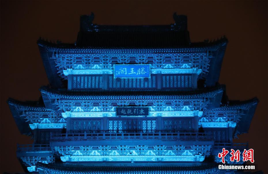 南昌滕王阁点亮蓝灯。刘占昆 摄