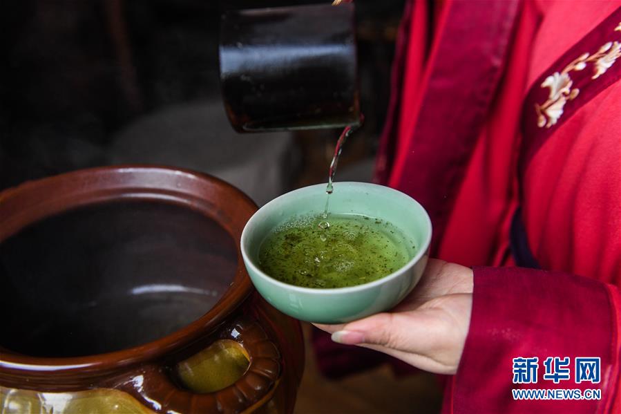 4月3日,长兴县水口乡大唐贡茶院的茶艺师按照传统工艺将茶粉、盐等放入水中搅拌并煮开,制成古法茶汤。新华社记者 徐昱 摄