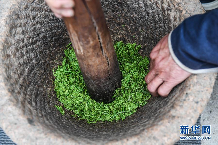 4月3日,郑福年把经过水蒸、烘干的紫笋茶放入石臼捣碎。新华社记者 徐昱 摄