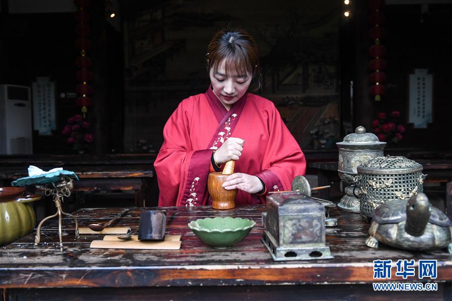 4月3日,长兴县水口乡大唐贡茶院的茶艺师用古法将茶饼捣碎,准备煮茶。新华社记者 徐昱 摄