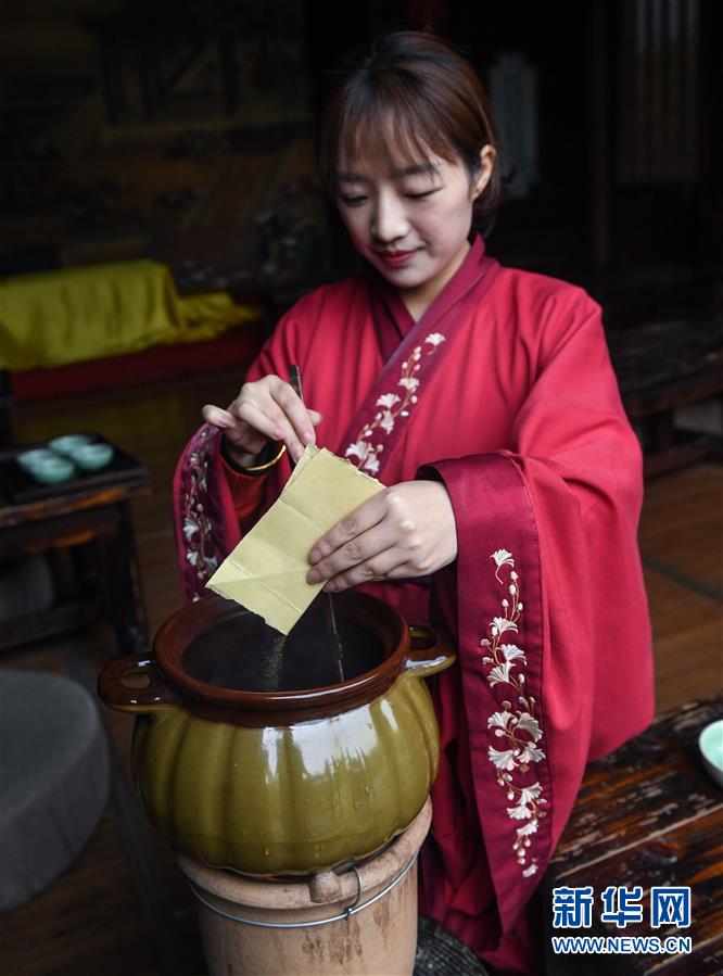 4月3日,长兴县水口乡大唐贡茶院的茶艺师把碾碎后的茶粉倒入器皿煮茶。新华社记者 徐昱 摄