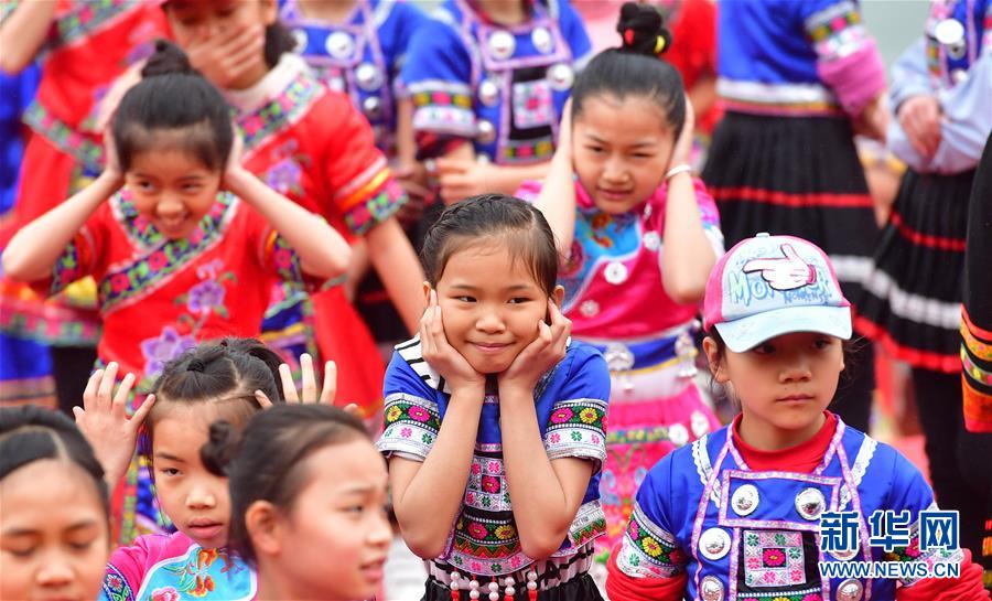 4月3日,在广西大化瑶族自治县县城,身着壮族服饰的小姑娘在排练文艺节目。 随着“壮族三月三”假期临近,广西各地陆续开展丰富多彩的民俗活动,喜迎节日。今年的“壮族三月三·八桂嘉年华”活动于3月25日至4月25日举行,在为期一个月的时间内,广西各地举行的各种庆祝活动预计超过900场。 新华社记者黄孝邦摄
