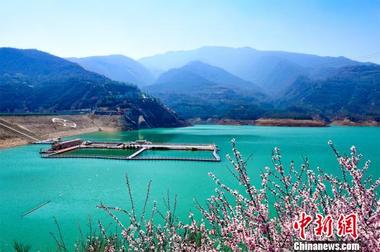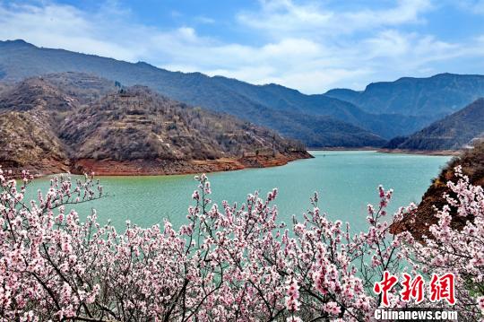 4月3日,甘肃平凉市崆峒山,盛开的桃花辉映蓝天碧水。 徐振华 摄