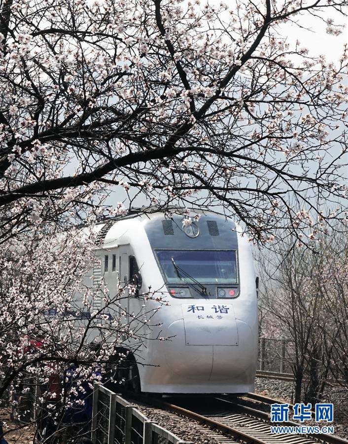 4月4日,一列火车在居庸关长城附近的花丛中穿行。近日,北京居庸关长城附近山花烂漫,春意盎然,火车穿行其间,成为春日美丽风景。目前,这里已修建栈道和观景台,供游人安全观景和拍照。新华社发(张燕辉 摄)
