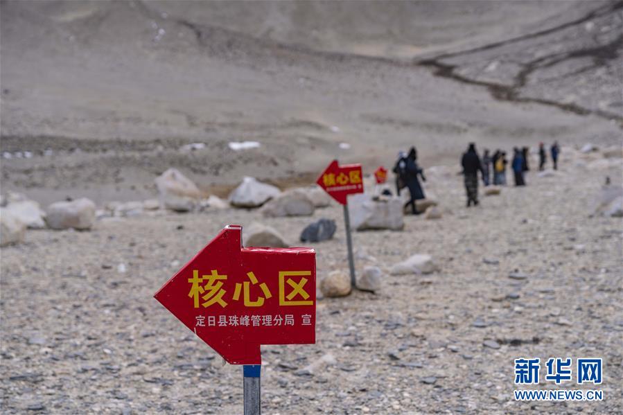 在珠穆朗玛峰国家级自然保护区内的绒布寺一带,定日县珠峰管理分局在保护区核心区边界处设立警示牌,提醒游客不要继续向核心区方向前行(4月6日摄)。 新华社发(孙非 摄)