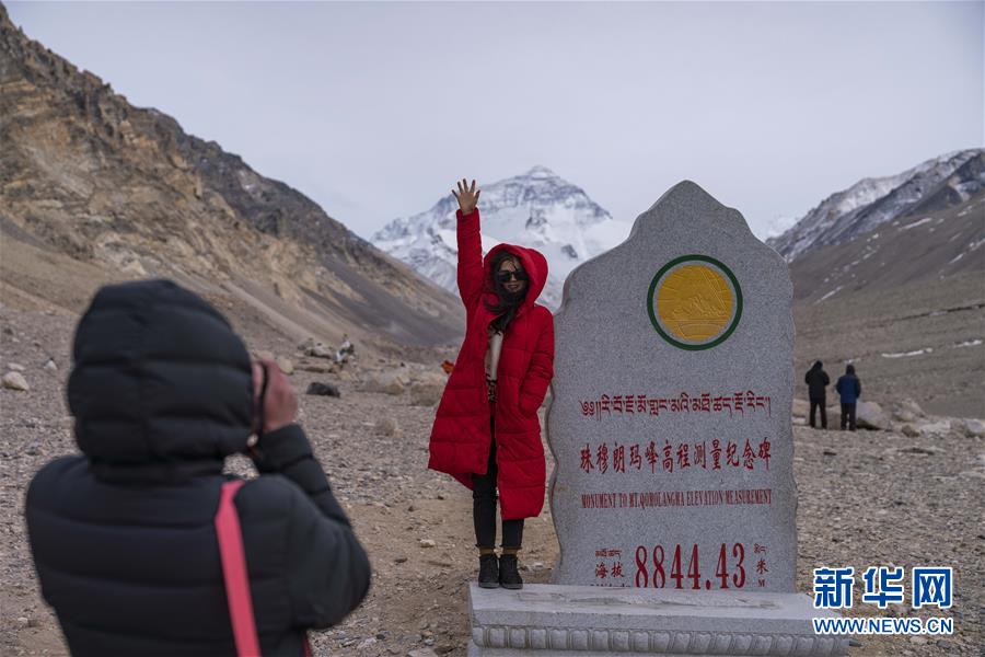 游客在珠穆朗玛峰脚下拍照留念(4月6日摄)。 新华社发(孙非 摄)