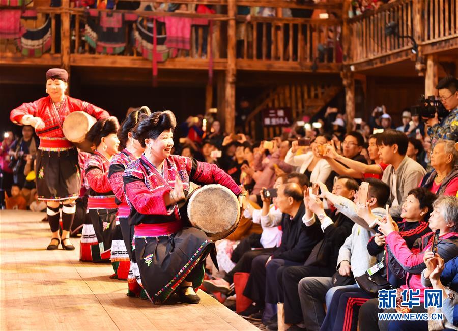 4月7日,广西龙胜黄洛瑶寨的瑶族群众为游客表演歌舞。 近年来,广西龙胜各族自治县黄洛瑶寨围绕少数民族风情大力发展旅游业,先后推出红瑶歌舞、长发梳妆、红瑶手工制品等特色旅游项目,当地不少瑶族群众依靠发展旅游实现脱贫致富。据介绍,2018年黄洛瑶寨接待游客15万人次,实现旅游收入700余万元。 新华社记者 曹祎铭 摄