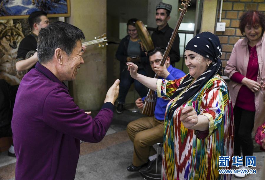游客和市民在乌鲁木齐大巴扎市场随音乐起舞(4月4日摄)。随着天气逐渐转暖,新疆乌鲁木齐市的大巴扎步行街及市场旅游逐渐升温。仅今年3月,大巴扎步行街及市场接纳游客达133万人次。 新华社记者王菲摄