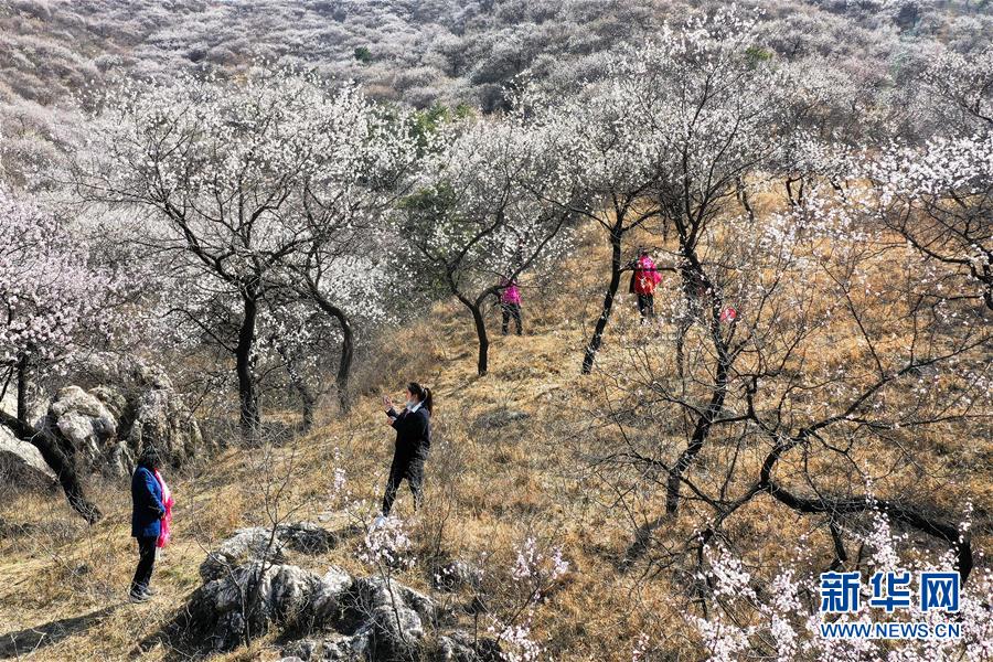 4月7日,游客在河北省迁西县兴城镇杏花谷参观(无人机拍摄)。清明时节,人们外出旅游,踏青赏花,感受春天的美好。 新华社发(王爱军 摄)